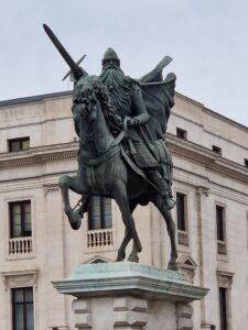 Loop na de poort linksaf over de promenade onder de platanen en langs de grote rivier, de Río Arlanzón. Hier is het meestal gezellig druk, er zijn veel terrasjes, eethuisjes en straatmuziek en -theater. Na een paar honderd meter kom je bij het monument van El Cid. Zoals je al aan het beeld kunt zien, wordt hij gezien als de grote Spaanse held. Eigenlijk heette hij Rodrigo Díaz de Vivar, maar hij is de geschiedenis in gegaan als El Cid Campeador. Hij speelde een belangrijke rol in de roemruchte 11e eeuw bij het tot stand komen van de diverse koninkrijken binnen Spanje en bij het verslaan van de Moren. Hij begon zijn carrière bij de vele gevechten tussen de vijf kinderen van Ferdinand I die na de dood van hun vader, ieder een stuk land erfden, maar dat van hun broers en zussen erbij wilden hebben. Toen uiteindelijk Alfonso het land van zijn broers en zussen in bezit had, werd het niet rustig: El Cid veroverde Sevilla, Zaragoza en nog veel meer, kreeg steeds meer macht en werd dus ontslagen door Alfonso. Maar Alfonso kon niet zonder zijn top-vechtersbaas en verleende gratie aan El Cid die vervolgens meteen aan de slag ging tegen de Moren. Uiteindelijk stierf El Cid in 1099, maar wel als vorst van Valencia.